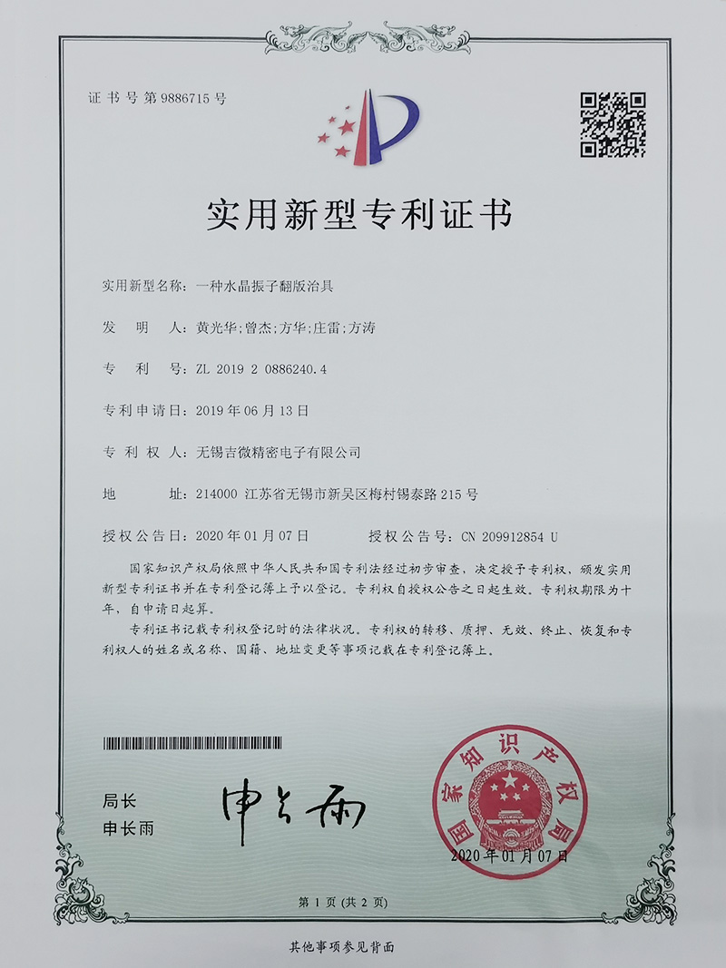 一種水晶振子翻版冶具實用新型專利證書